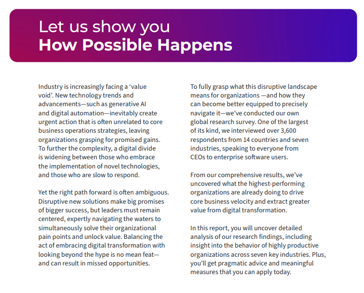 Took the role of lead writer on this giant brand campaign for this giant brand. Worked across a shitload of stuff, including the master research report that was followed by seven industry versions. Let me know if you want to read the full piece or want to see more examples.